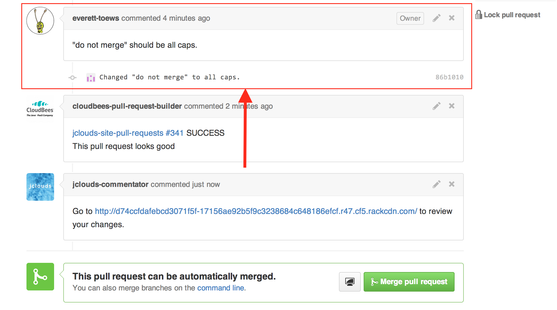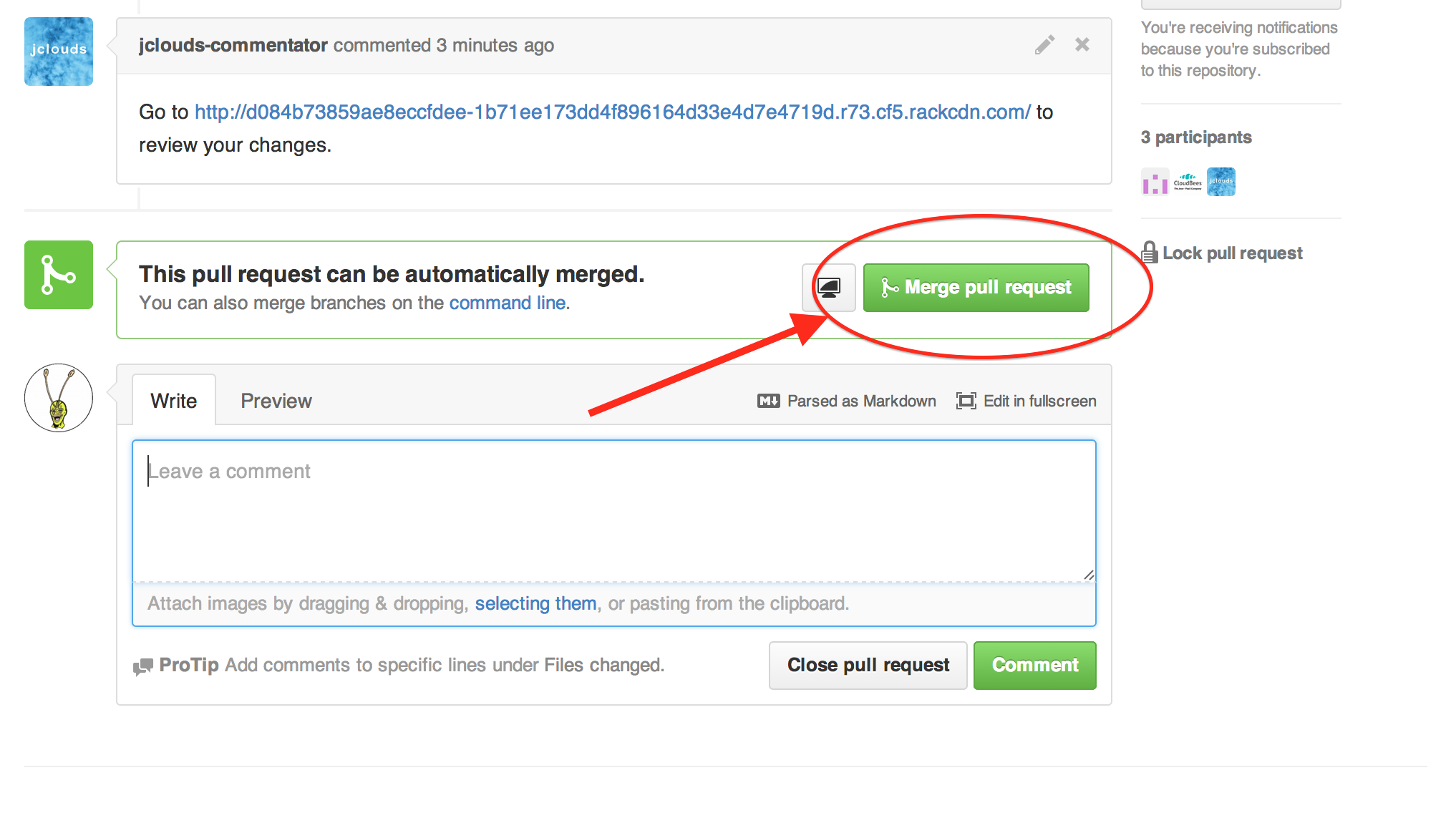 Jenkins, at the heart of the doc system, is responsible for building the website with Jekyll and uploading the staging jclouds website to Rackspace Cloud Files using jclouds. Installation and configuration of Jenkins itself is outside the scope of this post but it's relatively easy to get started using it. You need the GitHub Plugin and configure a webhook to fire when a pull request is made to your GitHub repo.